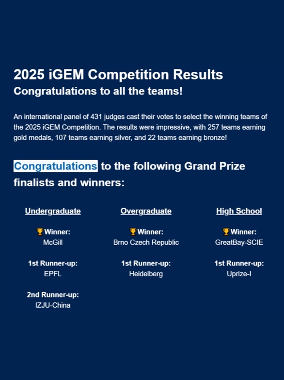 北京时间11月1日,2025年国际基因工程机器大赛(iGEM)在法国巴黎落下帷幕。来自浙江大学爱丁堡大学联合学院(ZJE)组建的本科生团队——IZJU-China代表队从全球412支顶尖队伍中脱颖而出,不仅勇夺本科生赛道全球金奖,更荣膺全球本科生组总排名第三的佳绩,刷新了团队历史最好成绩。团队基于对抗菌素耐药性问题的深刻洞察,前瞻性地开发了整合基因编辑系统与DNA折纸结构的FoCas平台,凭借该设计一举包揽了“传染病赛道-赛道最佳”和“最佳元件集合奖”两项特别大奖,并获得了“最佳建模奖提名”。https://competition.igem.org/results/2025